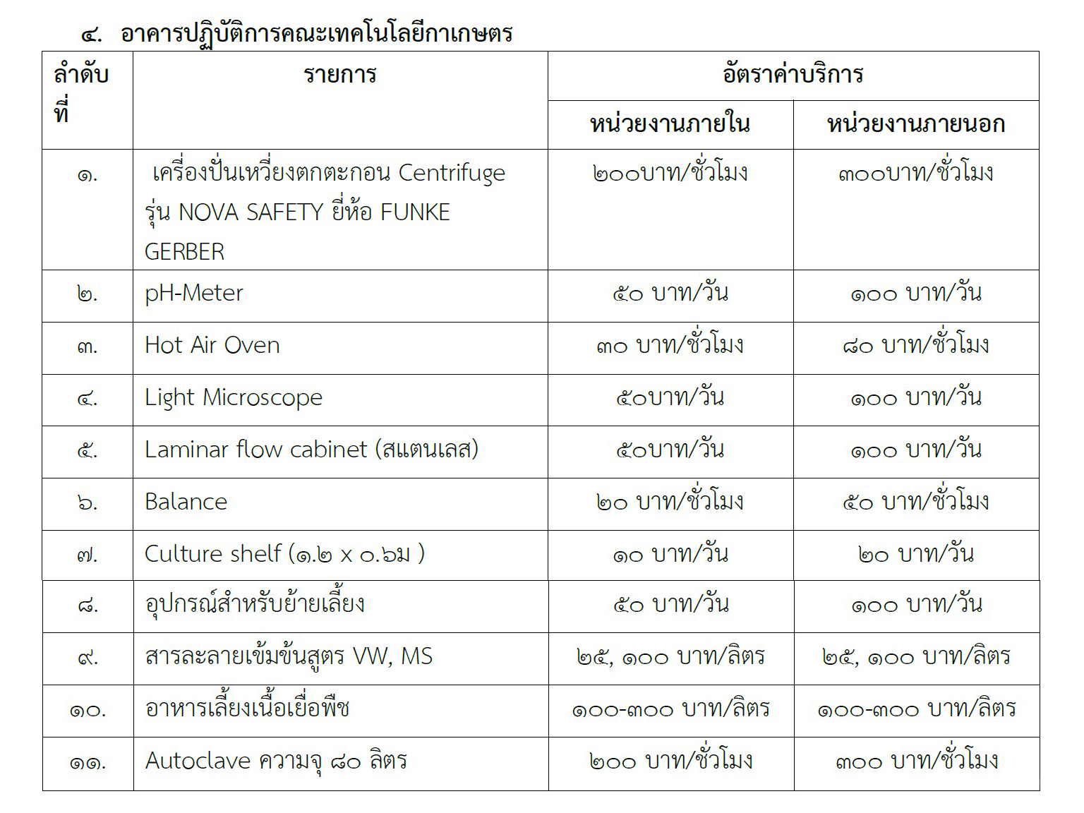 - ข้อ 3 อัตราค่าบริการการ ใช้ห้องปฏิบัติการ การตรวจวิเคราะห์ การใช้เครื่องมือวิทยาศาสตร์ ของคณะเทคโนโลยีการเกษตร เป็นไปตามที่แนบท้ายประกาศนี้