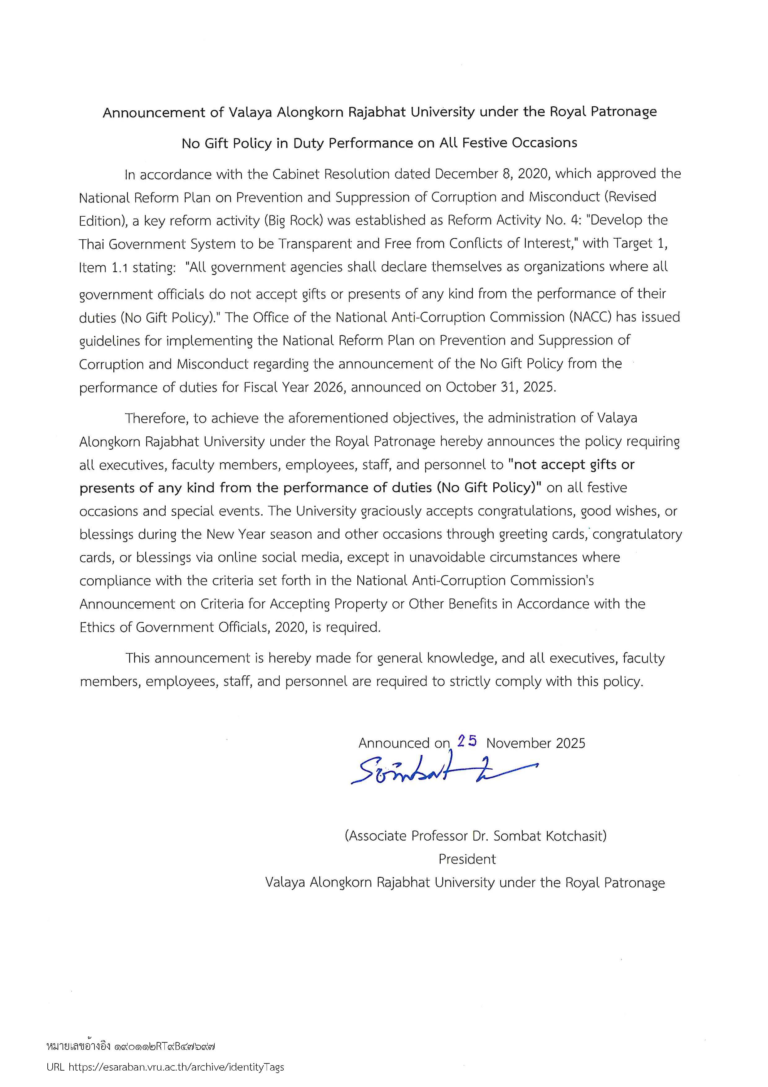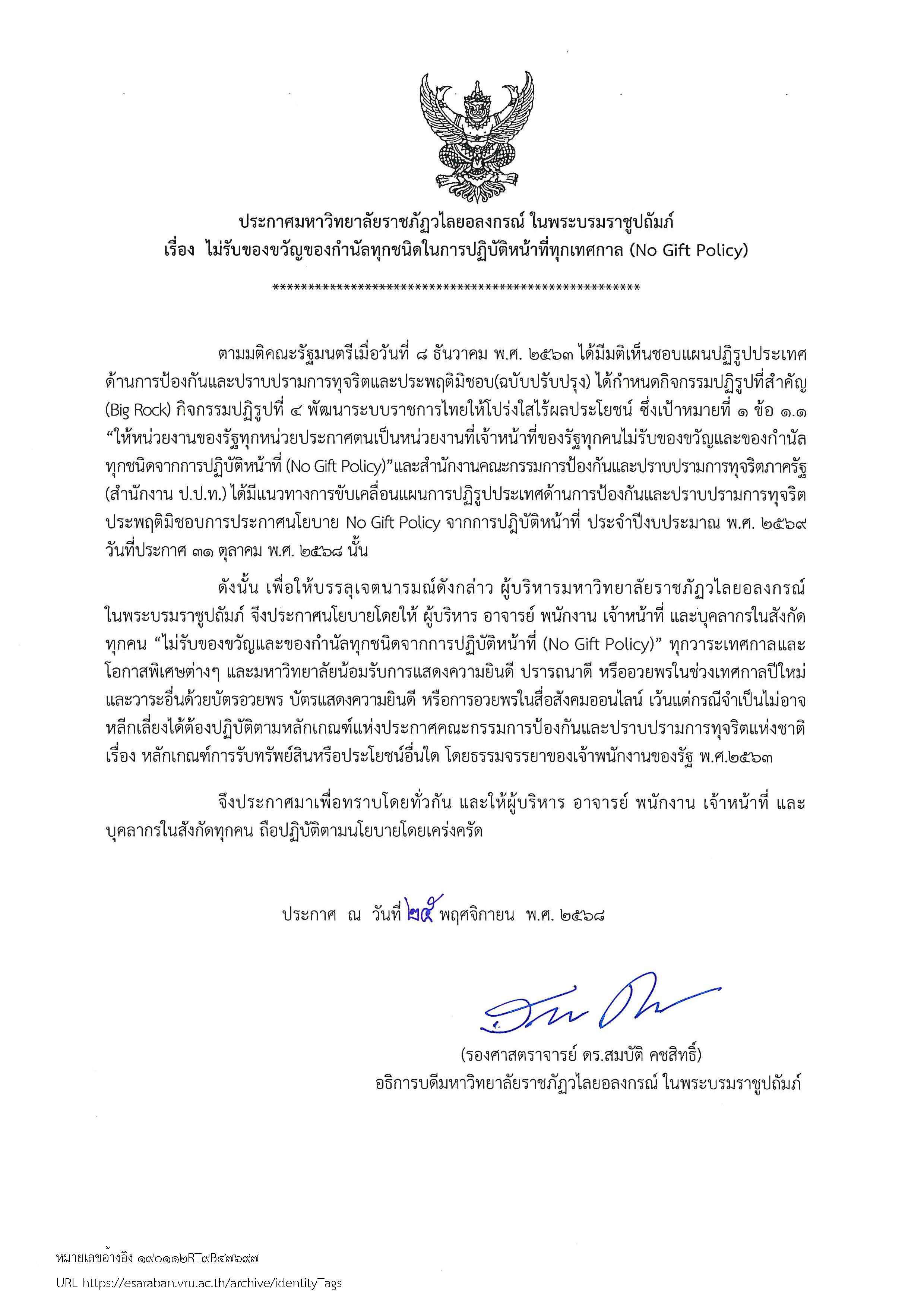 ๑. งดรับ งดให้ของขวัญและของกานัลทุกชนิดจากการปฏิบัติหน้าที่จากบุคคลหรือหน่วยงาน ภายนอกที่มาติดต่อมหาวิทยาลัยราชภัฏวไลยอลงกรณ์ ในพระบรมราชูปถัมภ์