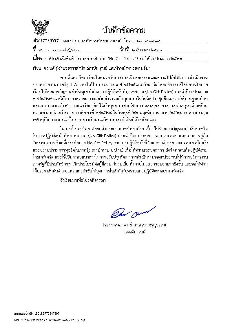 เรื่อง ไม่รับของขวัญของกำนัลทุกชนิดในการปฏิบัติหน้าที่ทุกเทศกาล (No Gift Policy) ประจำปีงบประมาณ พ.ศ. ๒๕๖๗